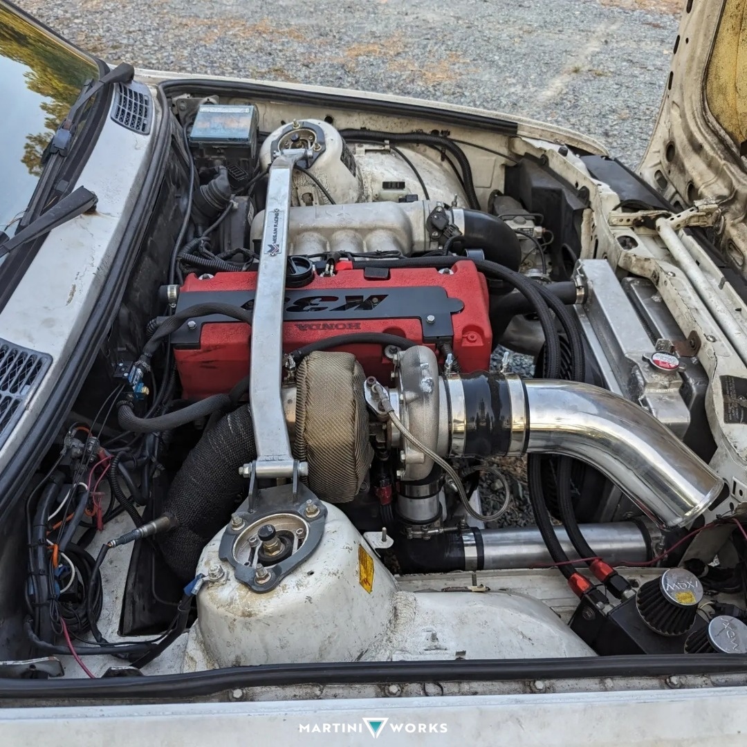 This car started out as a wannabe LS swap for an E36, but when my friend told me about a $600 E30 plans started to change. Figured out it would be a more fun swap to fit a K24 in the car with a turbo and allow us to actually have enough room in the bay to work on stuff. Had some trouble with the first company I worked with for the swap, but KPowered Industries has honestly been a life saver with this entire build. Car runs a JDM K24A with a good ol rev9 66-62 turbo, apparently running about 20 PSI of boost with a flex fuel system but mostly runs on straight e85 but a walbro 450 pump and Bosch 2200cc injectors. It is sitting on a set of BC racing coilovers with a welded medium case differential in the back. This car was supposed to be a fun daily driver. I was supposed to make a modest 300 to 350 horsepower but slowly spiraled into what it is now. I still drive this car all the time and has made many trips from North Carolina to Maryland for Honda day and is honestly one of my favorite cars I've ever driven.