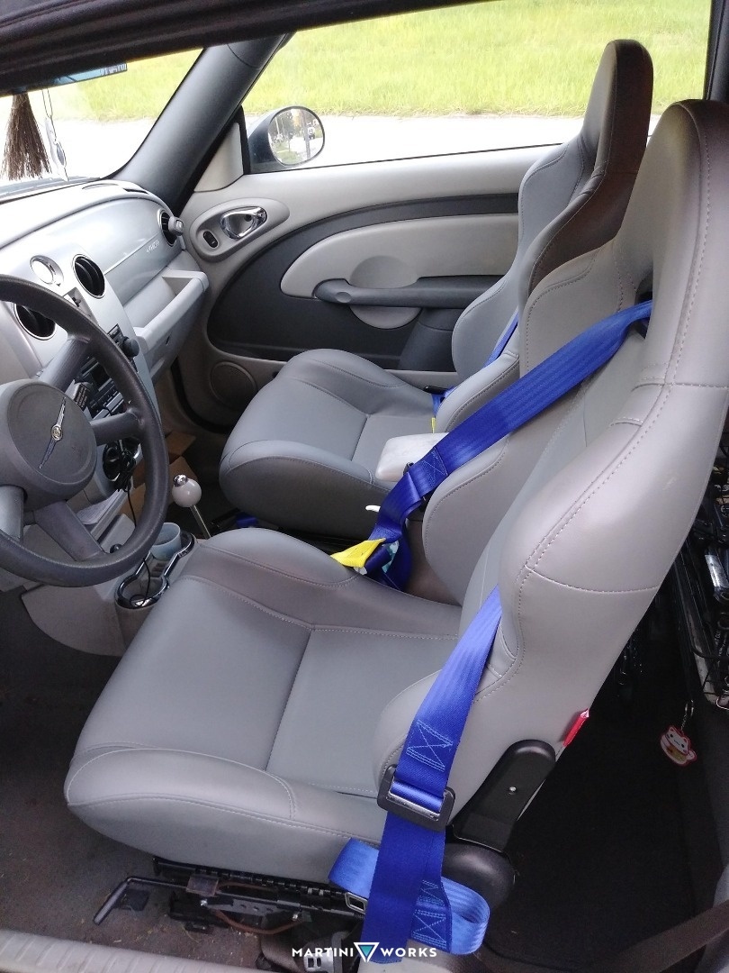 Ditched the Rear Seats and I have my Harness Bar supports rods bolted to their seat brackets instead. Front seats have been replaced with a pair of Chipher Auto brand reclinable bucket seats
