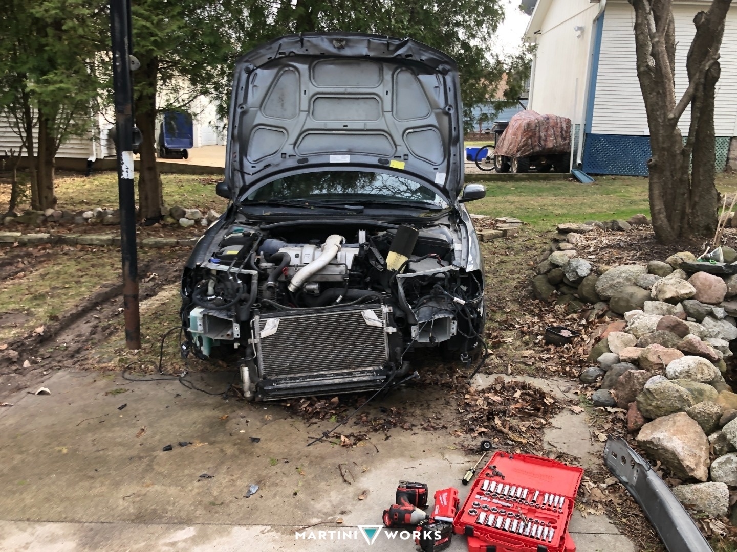 I originally found this car for a buddy back in 2020. He drove it till the fall of 2021 where he had an accident. He bought the car back from the insurance company and sold me the car to be fixed. Repairing the front end damage wasn't to difficult. I used a 06 Volvo XC70 to pull out some of the bent metal near the head lights, used multiple parts from my friends parts car, put the hood and bumper from the car, and it was ready to go. I've had to replace the right front cv axle and the angle gear (blew up the original one and current one leaks badly, but I have 3 more to put in the car).