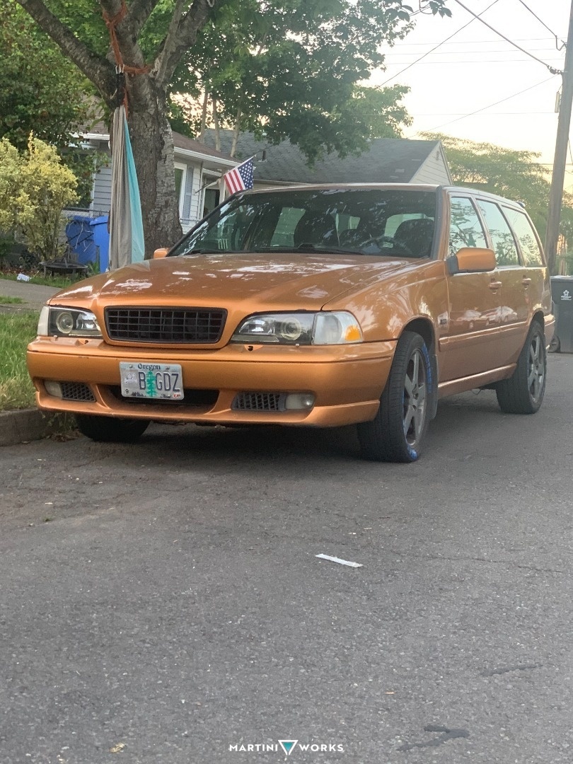 I bought it with a bad AWD system and a leaking headgasket so I ditched the awd rear subframe for a fwd one and put a different motor in the car with bigger green injectors, a tune from VAST and a 18t turbo. The boost controller was plumbed incorrectly so the motor saw 25 psi and blew up. Then the car sat for six months and I put another motor in the car and manual swapped the car with a m56. It used to have ksport coilovers that I got used but they were not damper adjustable to I switched to Bilstein B6 shocks and IPD lowering springs. It has a full turbo back exhaust from IPD but its a little too loud so in the future I'm gonna add another muffler that I've got laying around and a boost actuated cutout. Future plans include a respray in the original saffron color, a six speed m66 manual transmission and wideband gauge. Currently running Volvo Titan wheels that are super rare.