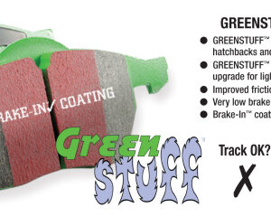 Designed for premium street driving offering better brake effect up to 600-degrees C (1100-degrees F). EBC Greenstuff has a high initial brake effect and gives drivers confidence from first application of the brake pedal. There is no such thing as a NO DUST pad. The very nature of how a brake works requires that some dust be generated to avoid rotor vibration (shimmying). The EBC pad creates less dust and dust is more easily washed off than most. All pads create more dust as they are bedding in especially if rotors are worn. Nominal friction coefficient 0.55. For heavier faster cars and vehicles above 200bhp we strongly recommend Redstuff which DOES offer much less dust.