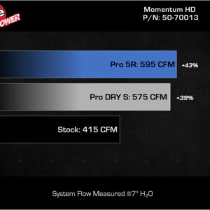 Large Five Layer Performance Air Filter:The Momentum’s unique filter-to-housing interface was built to feature the largest air filter possible. This aFe POWER Pro 5R is a pre-oiled, 360-degree, radial flow air filter designed for maximum performance. It features an inverted top, allowing for more surface area, higher flow, and more dust holding capacity. Five layers of progressively finer cotton gauze media provide your engine with the largest amount of high-flowing air, usually resulting in the highest power gains, out of all our filter media options. This media is perfect for street and/or track use.Unique One-Piece Housing:The textured one-piece sealed housing, constructed of cross-linked polyethylene (XLPE), is used to eliminate the use of an overabundance of parts and ensure the coolest air intake charge possible. A large, clear sight window allows for hassle-free filter inspection, without having to disassemble your system. An optional auxiliary air inlet pulls in additional cool air from the inner fender when under power.Massive Dyno-Tuned Intake Tube:This system features a high quality, computer-designed, dyno-tuned intake tube to achieve maximum power gains while maintaining a perfect fit. Its XLPE material is heat soak resistant and extremely durable.Premium Components:Stainless-steel T-Bolt clamps and an injection molded coupling are included for strength and durability, while also providing the most secure installation available. Momentum GT intakes are designed with fewer parts and utilize factory mounting points for a fast and easy installation.Note:Application includes models equipped with the e-torque engine option.