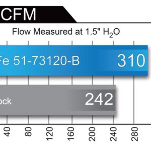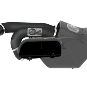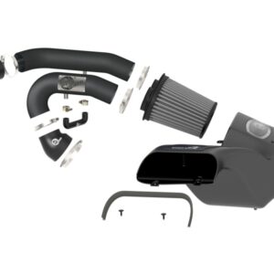 This intake system utilizes oil-free, large 7" tall conical 360 degree radial flow performance air filter with 3-Layer progressively finer porosity synthetic media for maximum convenience. The smooth one-piece sealed housing is used to eliminate the use of multiple-piece housings and ensure the coolest air intake charge available. A large, clear sight window is used for a hassle-free filter inspection and an aggressive style. Dual mandrel-bent powder-coated wrinkle-black aluminum equal length intake tubes are designed with an H-pipe to balance intake tube pressure and maximizes airflow and velocity. Also included, an exclusive black riveted aFe Power badge. This is a direct bolt-on kit that requires no cutting or drilling on factory parts.